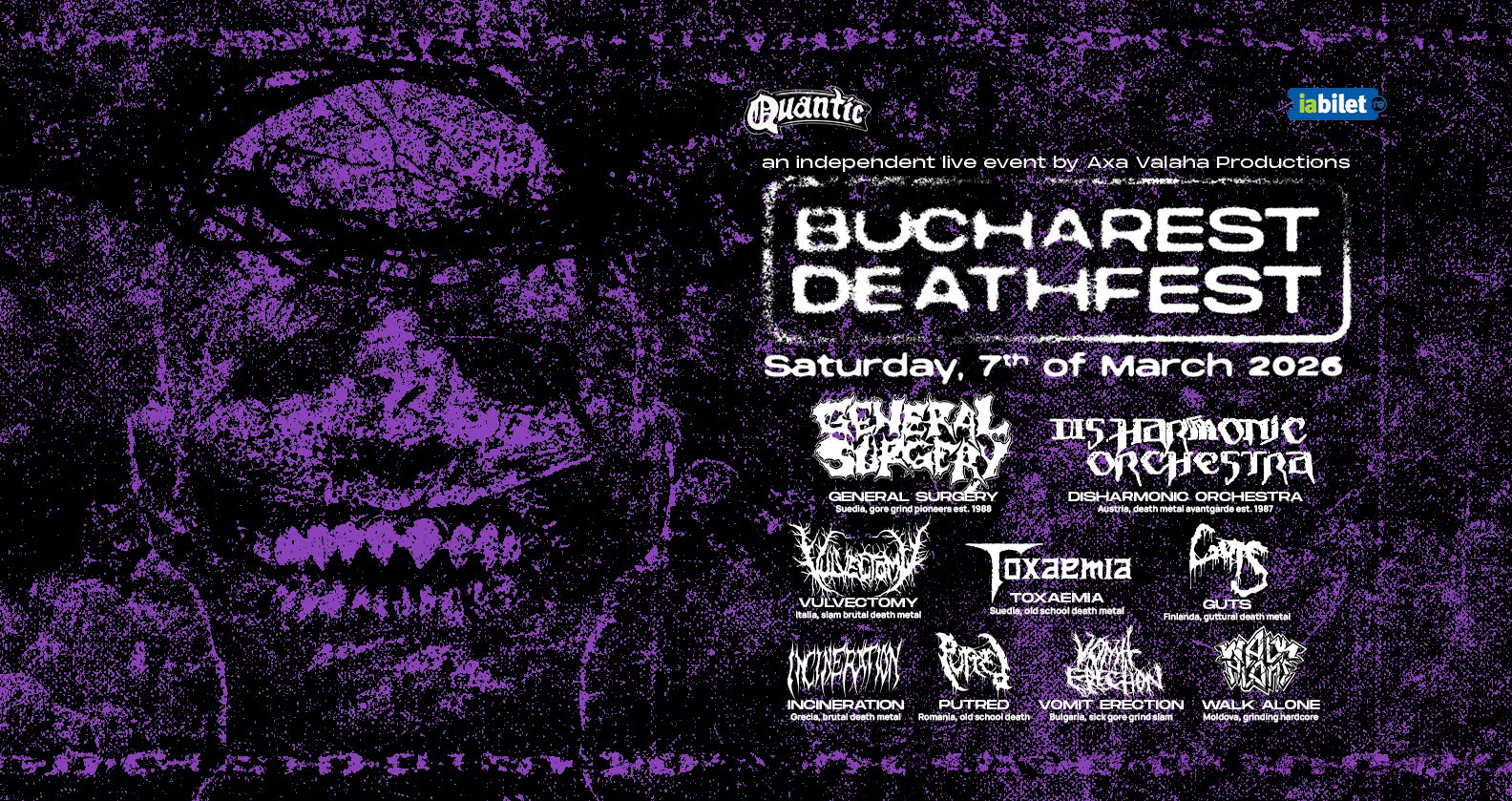 Primavara incepe abrupt si brutal cu 11 trupe death metal si alte genuri asociate, cele mai multe in premiera in Romania, metal market consistent, atmosfera de carnaval pentru cine simte nevoia sa se costumeze, liber la dansuri, crowdsurfing si mosphit obligatoriu, food & drinks pe alese prin intermediul Quantic.
