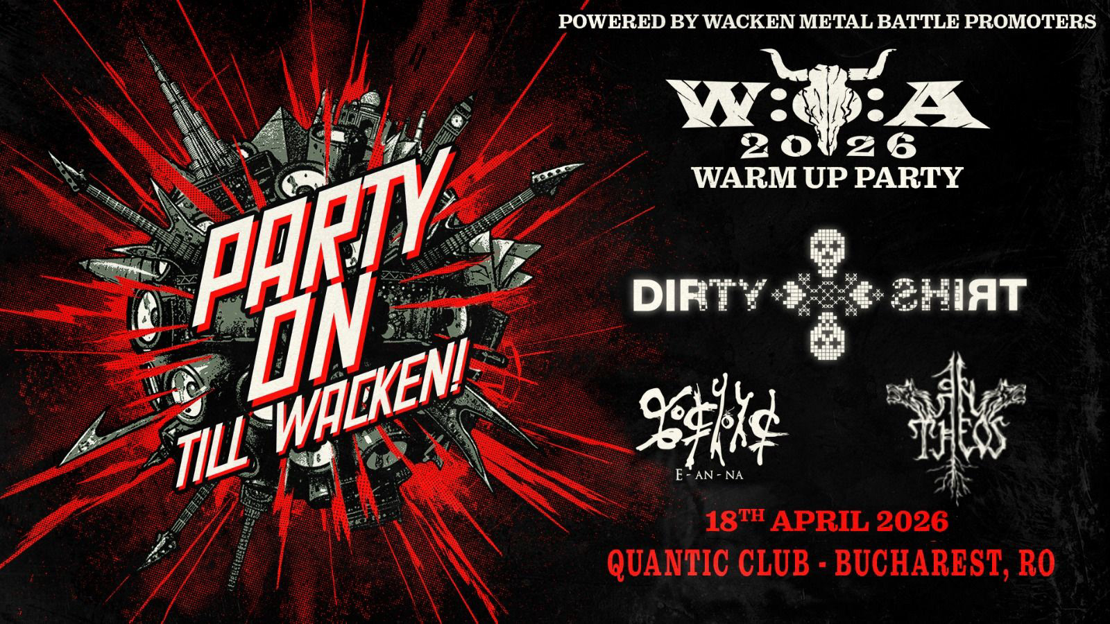 🤘 Pe 18 aprilie 2026, de la ora 19:00, la Club Quantic București, urcă pe scenă crema underground-ului românesc! Cele mai apreciate și puternice trupe ale momentului, artiști validați pe scena internațională de la Wacken, se reunesc într-un eveniment demn de cel mai mare festival metal din lume. Dacă iubești metalul autentic, aici trebuie să fii!